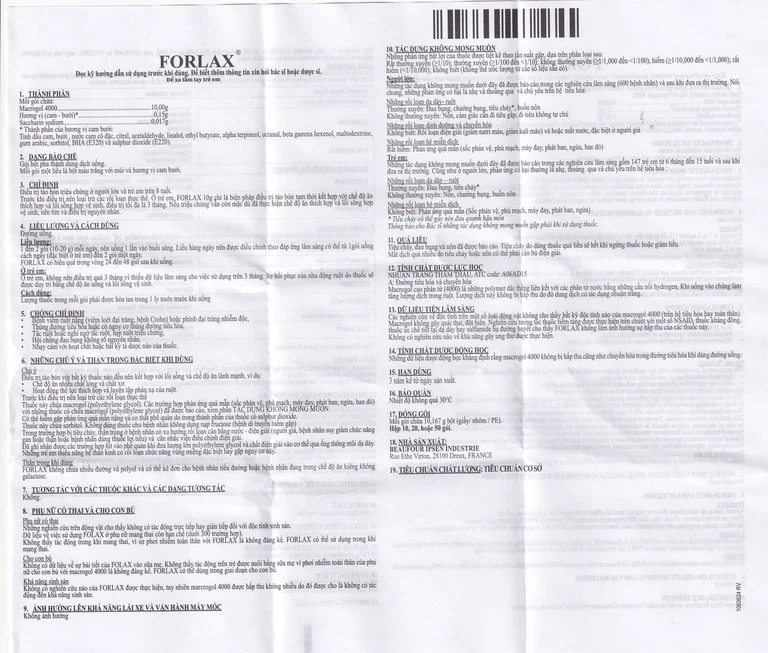 Thuốc Forlax được sản xuất bởi Beaufour Ipsen Industrie, với thành phần chính Macrogol, là thuốc dùng để điều trị triệu chứng táo bón ở người lớn và trẻ em trên 8 tuổi.