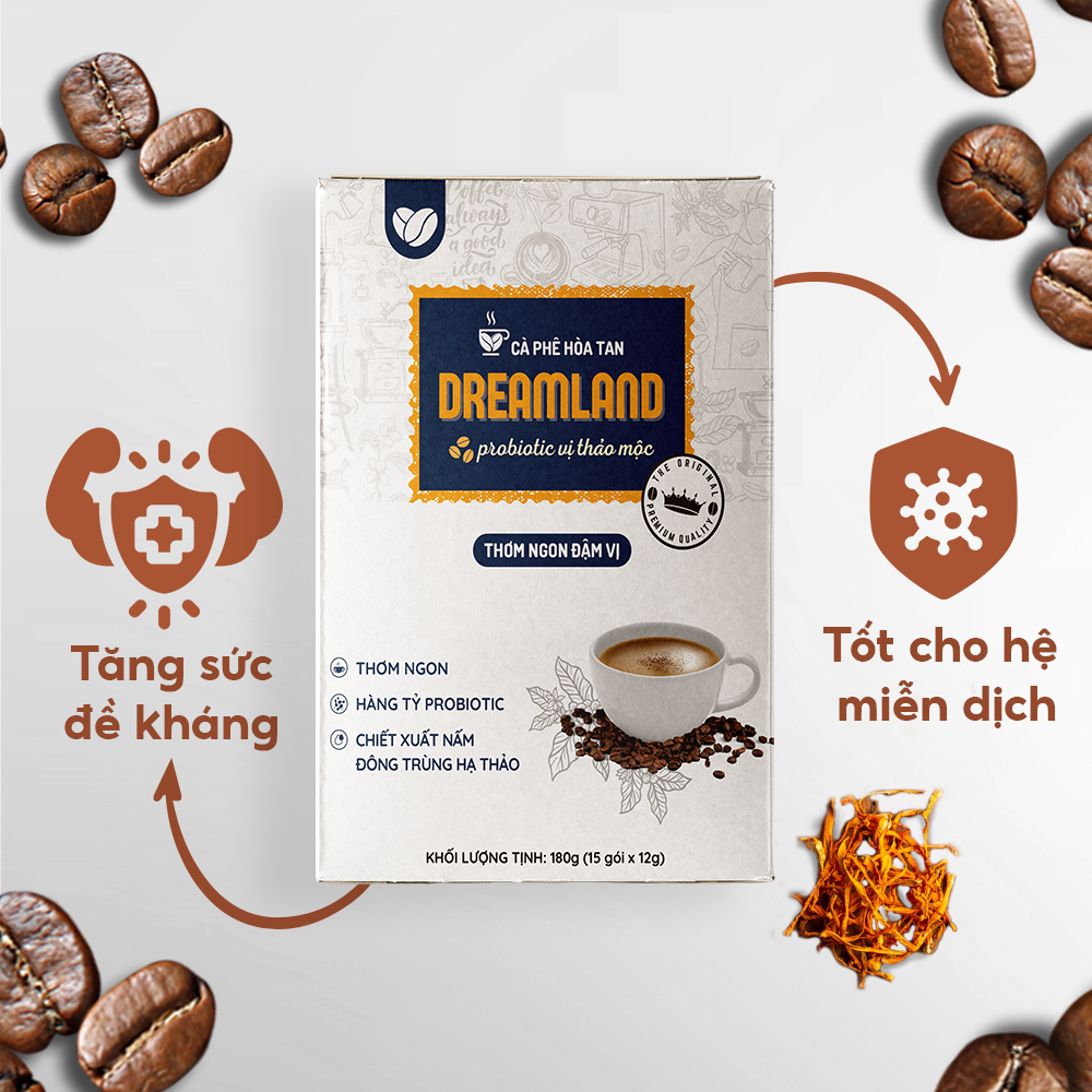 Đừng để nỗi lo về hệ tiêu hóa ngăn cản bạn thưởng thức cà phê! Hãy chọn Cà phê hòa tan Dreamland Probiotic Vị Thảo Mộc ngay hôm nay!