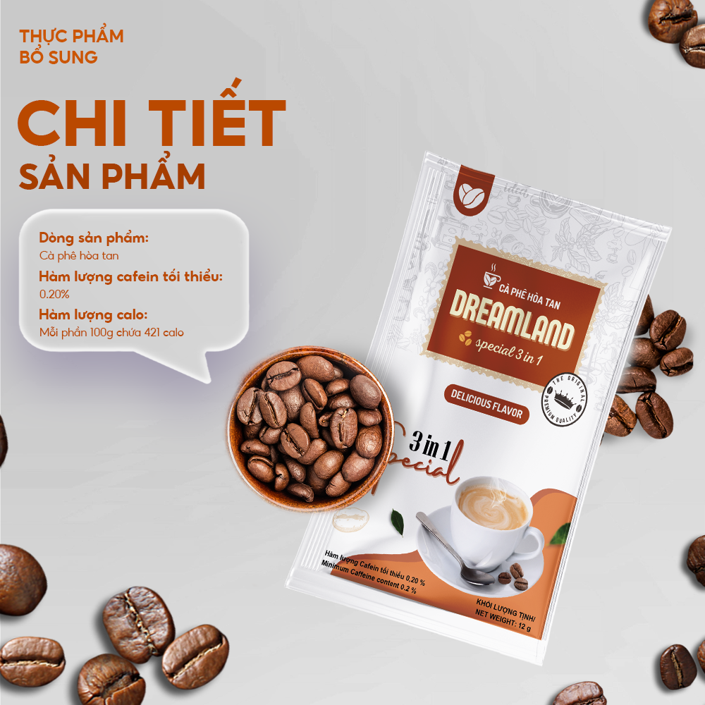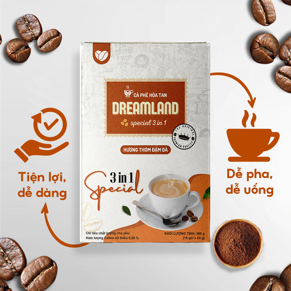 - Chỉ trong tích tắc, một gói cà phê hòa tan Dreamland Special 3 in 1 và nước nóng sẽ mang đến cho bạn ly cà phê sữa thơm ngon, đậm đà, sẵn sàng tiếp thêm năng lượng cho ngày mới.