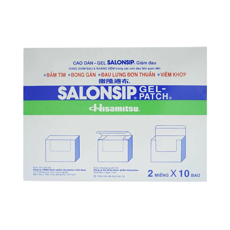 Cao dán lạnh Salonsip Gel-patch được sản xuất bởi Công Ty TNHH Dược Phẩm Hisamitsu Việt Nam, thành phần chính là hlycol salicylate, L – Menthol, DL – Camphor, tocopherol acetate, được dùng để giảm đau và kháng viêm trong các cơn đau liên quan đến mỏi cơ, đau cơ, đau vai, đau lưng đơn thuần, bầm tím, bong gân, căng cơ, viêm khớp.