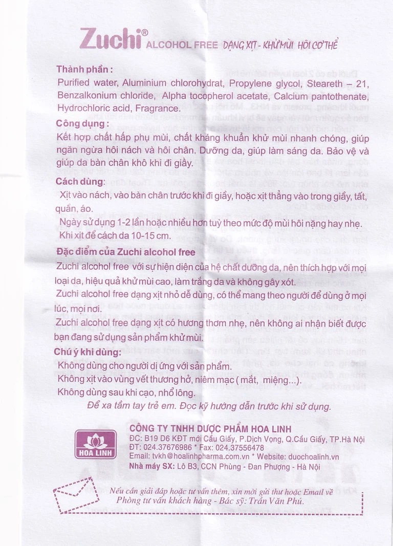 Xịt khử mùi Zuchi với các thành phần tự nhiên, an toàn không hại da, có thể dùng thường xuyên. Sản phẩm được phát triển với hệ dung môi đặc biệt, khô nhanh và không nhờn, không dính bẩn.