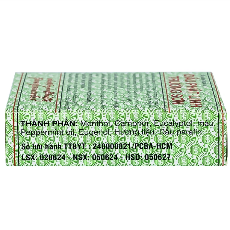 Menthol: Thành phần Menthol có trong dầu Phật Linh Trường Sơn có công dụng chính trong việc gây tê tạm thời và chống phản ứng kích ứng cục bộ nên thường được dùng để chữa các chứng kích ứng nhẹ.