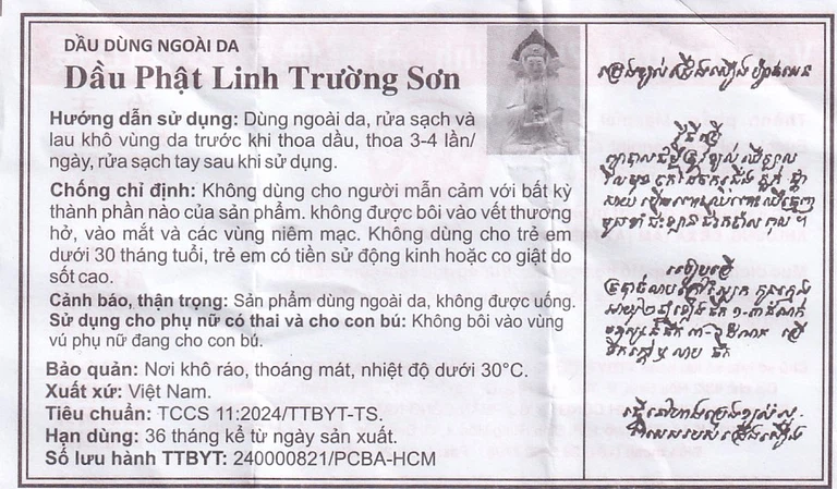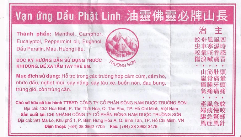 Dầu Phật Linh Trường Sơn là sản phẩm dầu thông dụng tại Việt Nam, được ưa chuộng sử dụng trong hỗ trợ điều trị các trường hợp cảm, ho, sổ mũi, nhức đầu, say nắng, trúng gió, say tàu xe, buồn nôn, đau bụng, sưng viêm, nhức mỏi, muỗi chích, kiến cắn, tê thấp tay chân.