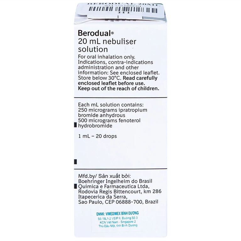 Tác dụng quá liều chủ yếu liên quan đến fenoterol. Các triệu chứng gặp phải khi quá liều là các triệu chứng do kích thích beta adrenergic quá mức, chủ yếu là nhịp tim nhanh, đánh trống ngực, run, tăng huyết áp, hạ huyết áp, áp lực mạch đập rộng, đau thắt ngực, loạn nhịp và đỏ bừng mặt. Cũng quan sát thấy nhiễm toan chuyển hóa khi dùng fenoterol với liều cao hơn liều khuyến cáo điều trị được chỉ định cho Berodual 20ml.