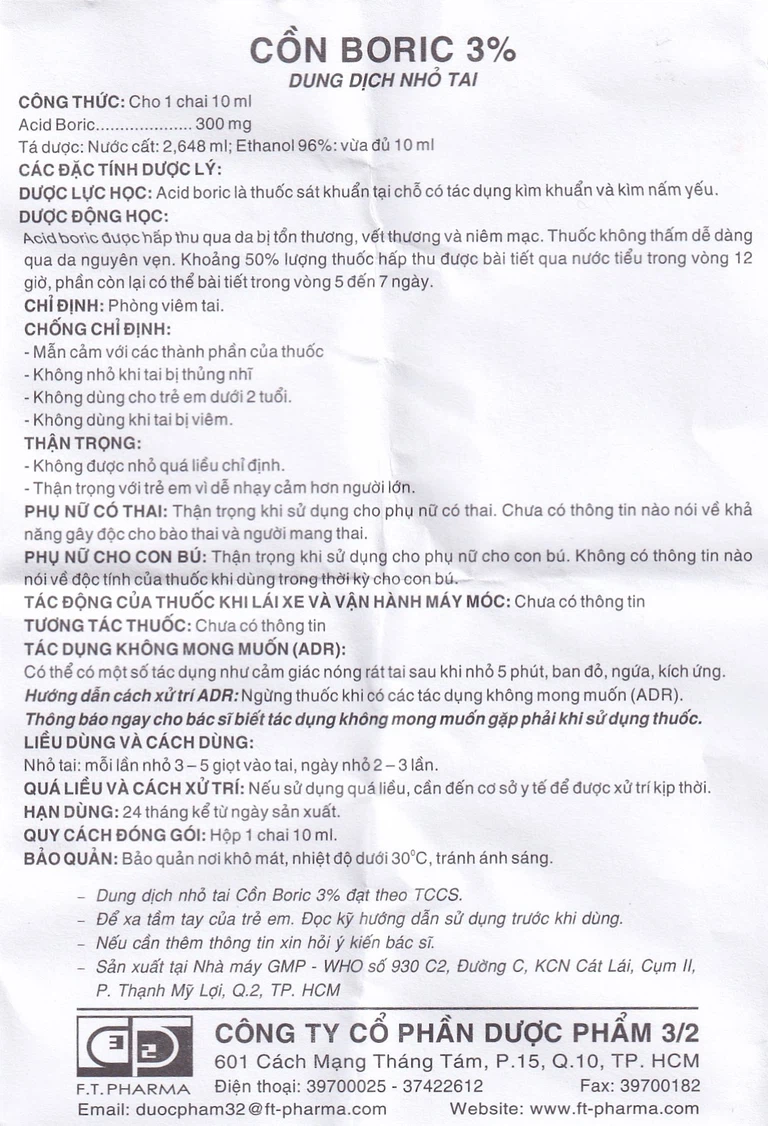 Công dụng của Dung dịch nhỏ tai Cồn Boric 3%