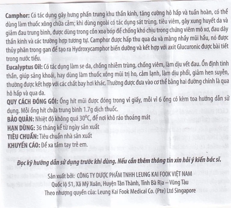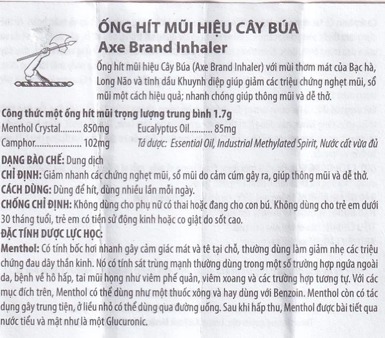 Ống hít mũi hiệu Cây Búa Axe Brand Inhaler là một sản phẩm của Công ty TNHH Dược phẩm Leung Kai Fook Việt Nam (Lkf-Vn), là thuốc dùng trong điều trị ngạt mũi và cảm cúm, với các hoạt chất là Menthol Crystal, Camphor và Eucalyptol Oil.