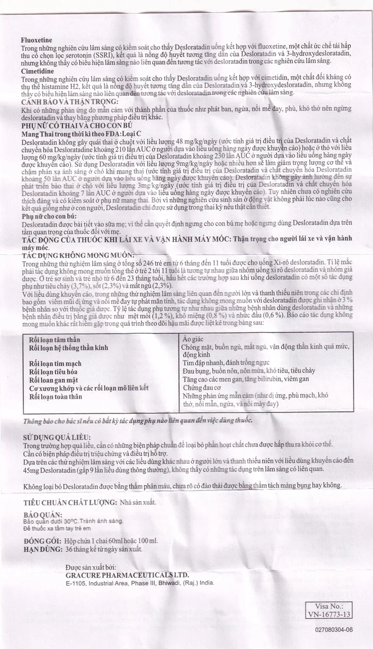 Destacure 2.5mg/5ml của nhà sản xuất Gracure (Ấn Độ), thành phần chính desloratadine, là thuốc dùng để điều trị viêm mũi dị ứng theo mùa, viêm mũi dị ứng lâu năm, chứng mề đay tự phát mãn tính.