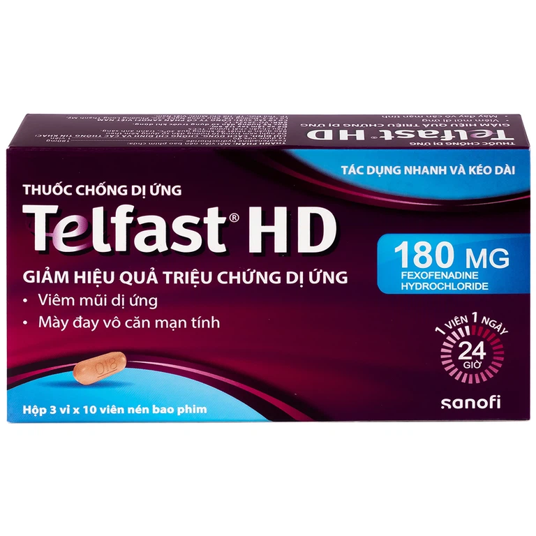 Thuốc Telfast HD 180mg được sản xuất bởi công ty Cổ Phần Sanofi Việt Nam, được chỉ định để điều trị viêm mũi dị ứng theo mùa và các biểu hiện ngoài da không biến chứng của mày đay vô căn mạn tính ở người lớn và trẻ em từ 12 tuổi trở lên.