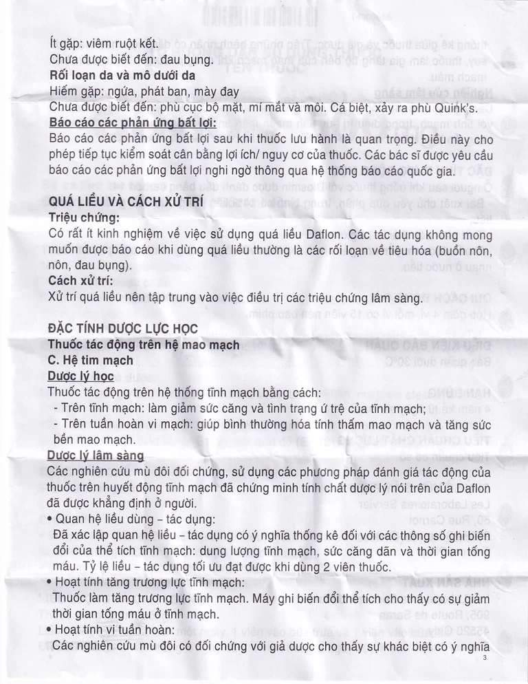 Triệu chứng: Có rất ít kinh nghiệm về việc sử dụng quá liều Daflon 500Mg. Các tác dụng không mong muốn được báo cáo khi dùng quá liều thường là các rối loạn về tiêu hóa (buồn nôn, nôn, đau bụng).