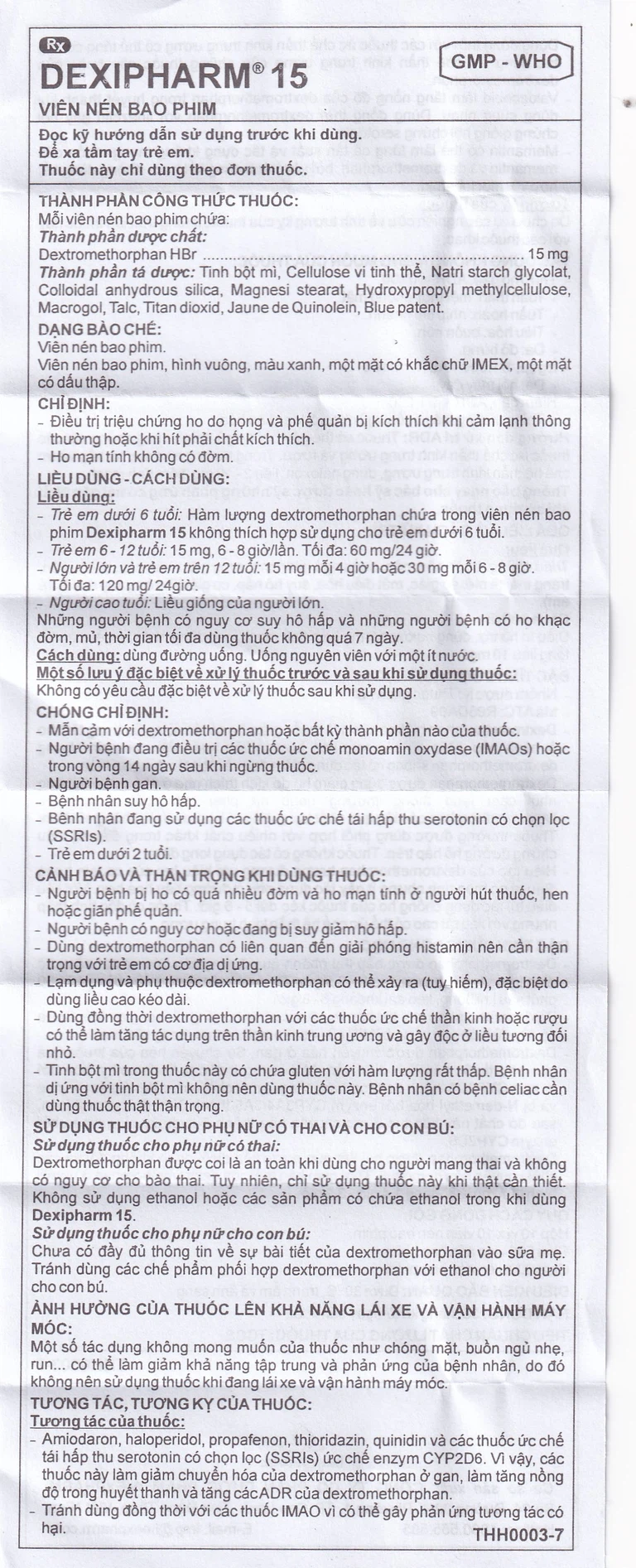 Trẻ em dưới 6 tuổi: Hàm lượng dextromethorphan chứa trong viên nén bao phim Dexipharm 15 không thích hợp sử dụng cho trẻ em dưới 6 tuổi.
