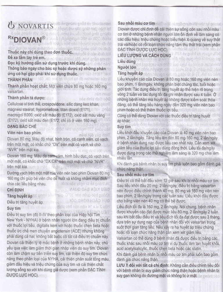 Thuốc Diovan của Công ty Novartis Pharma AG – Thụy Sĩ, thành phần chính Valsartan là một loại thuốc được dùng để điều trị bệnh tăng huyết áp và suy tim.