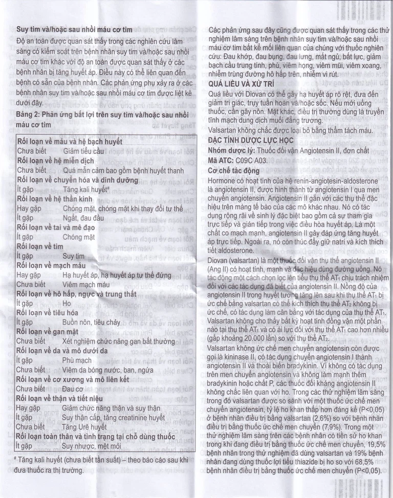 Sử dụng Diovan ở những bệnh nhân bị suy tim hoặc sau nhồi máu cơ tim thường dẫn đến giảm phần nào về huyết áp, nhưng việc ngừng dùng Diovan do hạ huyết áp triệu chứng đang diễn tiến thường không cần thiết miễn là dùng liều theo đúng chỉ dẫn.