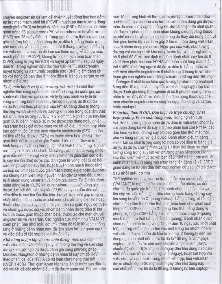 Chất lượng sống, Phân suất tống máu. Trong nghiên cứu Val – HeFT, những bệnh nhân được điều trị valsartan cho thấy cải thiện đáng kể về độ suy tim theo phân loại của NYHA, các dấu hiệu và triệu chứng suy tim bao gồm khó thở, mệt mỏi, phù và tiếng ran so với giả dược.