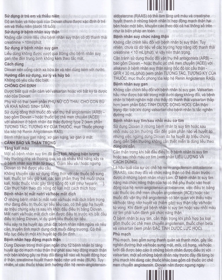 Cần thận trọng khi sử dụng đồng thời thuốc đối kháng thụ thể Angiotensin (ARBs), bao gồm Diovan, với các thuốc khác phong tỏa hệ RAS như thuốc ức chế men chuyển (ACEIs) hoặc Aliskiren (xem phần TƯƠNG TÁC THUỐC, mục Thuốc phong tỏa kép hệ Renin-Angiotensin).