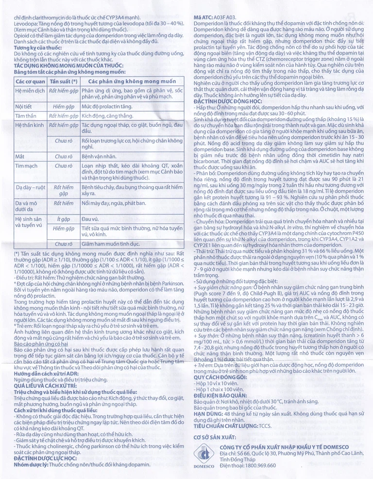 Domperidone là thuốc đối kháng thụ thể dopamine với đặc tính chống nôn. Domperidone không dễ dàng qua được hàng rào máu não. Ở người sử dụng domperidone, đặc biệt là người lớn, tác dụng không mong muốn như hội chứng ngoại tháp rất hiếm gặp, nhưng domperidone thúc đẩy sự tiết prolactin tại tuyến yên.