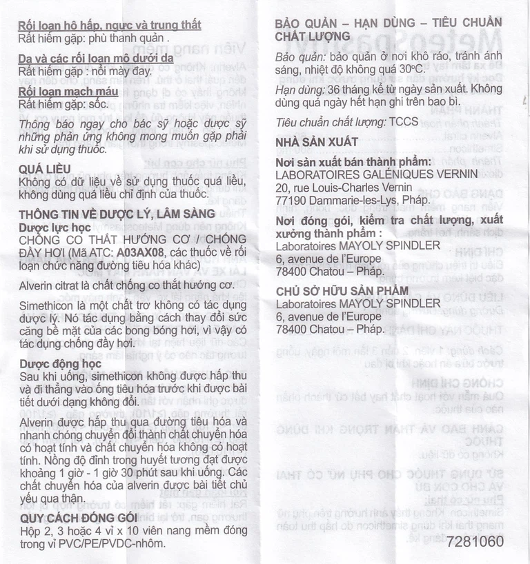 Meteospasmyl của Công ty Laboratoires Mayoly Spindler – Pháp, hoạt chất chính Alverin (hàm lượng 60mg) và Simethicone (hàm lượng 300mg), là thuốc được dùng để điều trị các rối loạn đường ruột.