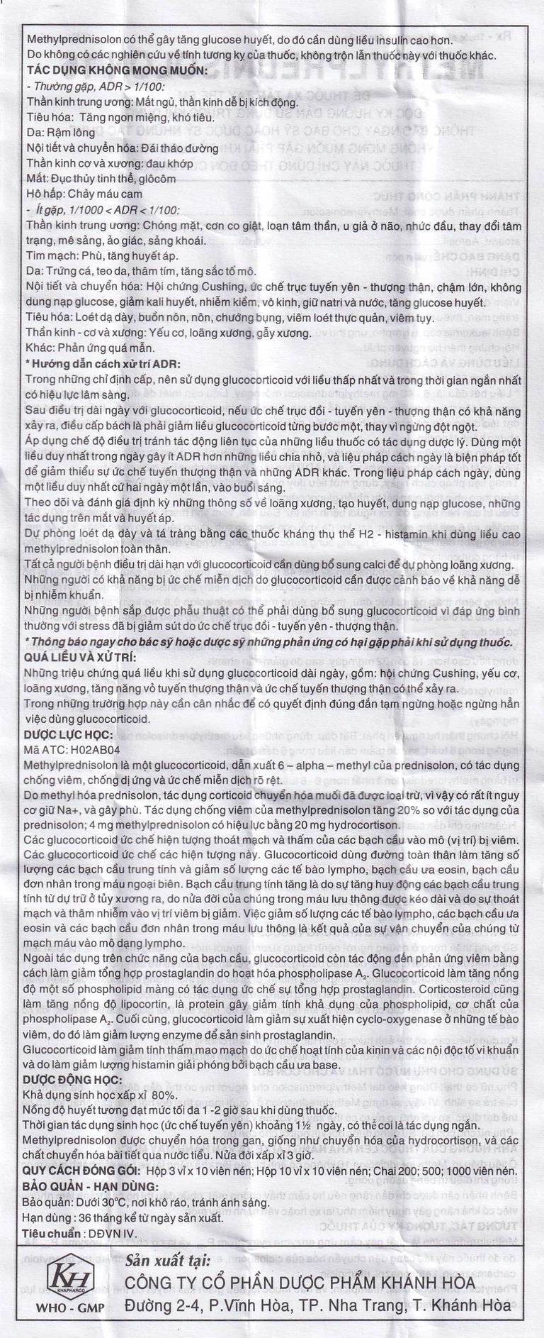 Thuốc Methylprednisolon 16mg là sản phẩm của Công ty Cổ phần Dược phẩm Khánh Hòa (Khapharco) được bào chế dưới dạng viên nén. Mỗi viên nén chứa 16 mg methylprednisolon, được sử dụng để điều trị các bệnh như viêm khớp dạng thấp, lupus ban đỏ hệ thống, một số thể viêm mạch. Viêm động mạch thái dương, viêm quanh động mạch nốt, bệnh sarcoid, hen phế quản…