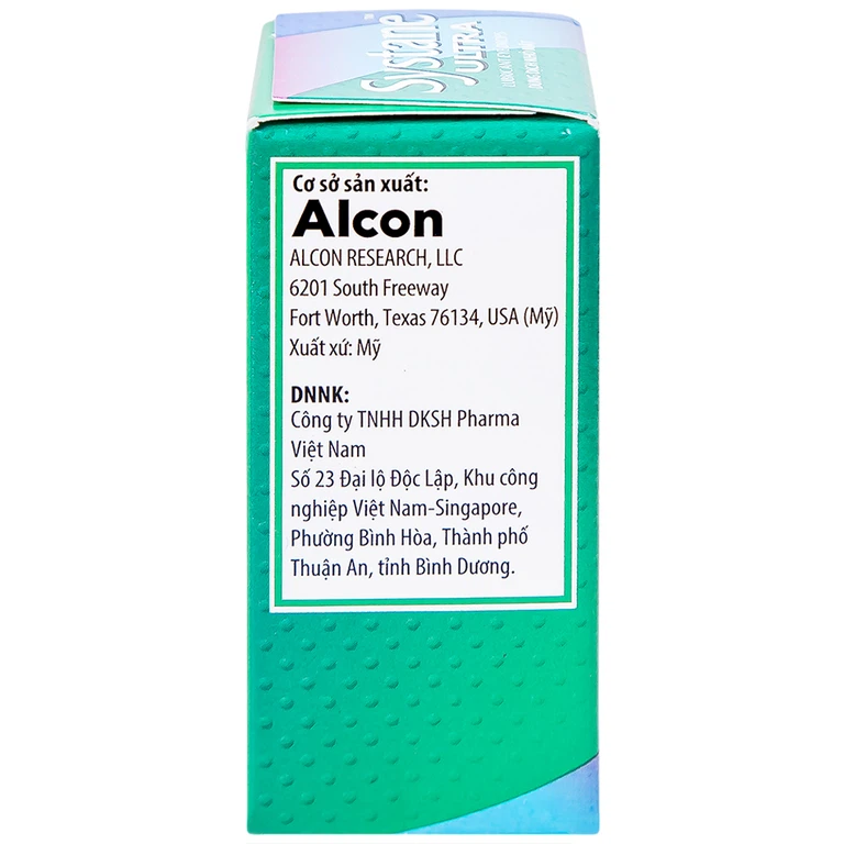 Thuốc nhỏ mắt Systane Ultra 5ml của Alcon Laboratories, inc., chứa dược chất chính gồm polyethylen glycol 400 và propylen glycol, được dùng để làm giảm tạm thời các chứng rát và kích ứng do khô mắt.