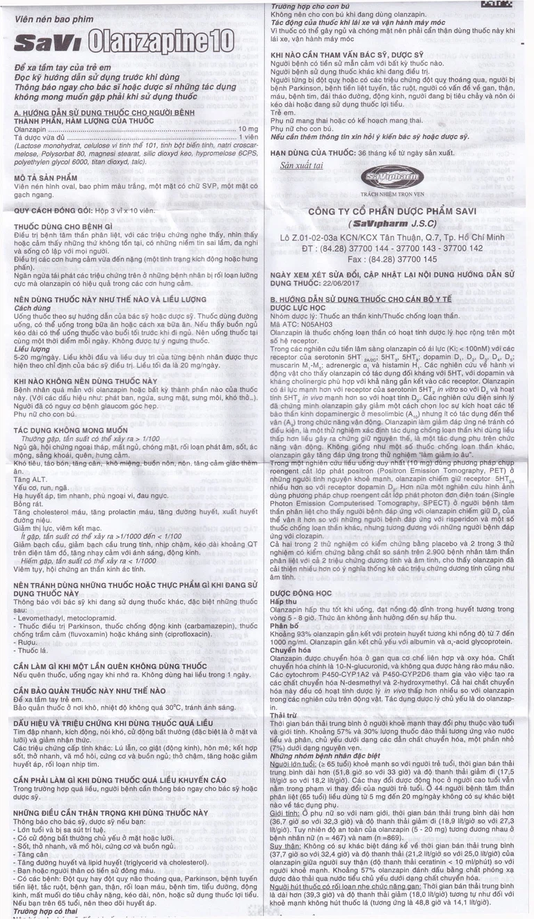 Thuốc Savi Olanzapine 10 do Công ty Savipharm sản xuất. Hình thái là viên nén hình oval, bao phim màu trắng, một mặt có chữ “SVP”, một mặt có gạch ngang. Thuốc có hoạt chất chính là olazapin, thuộc nhóm thuốc chống loạn thần.