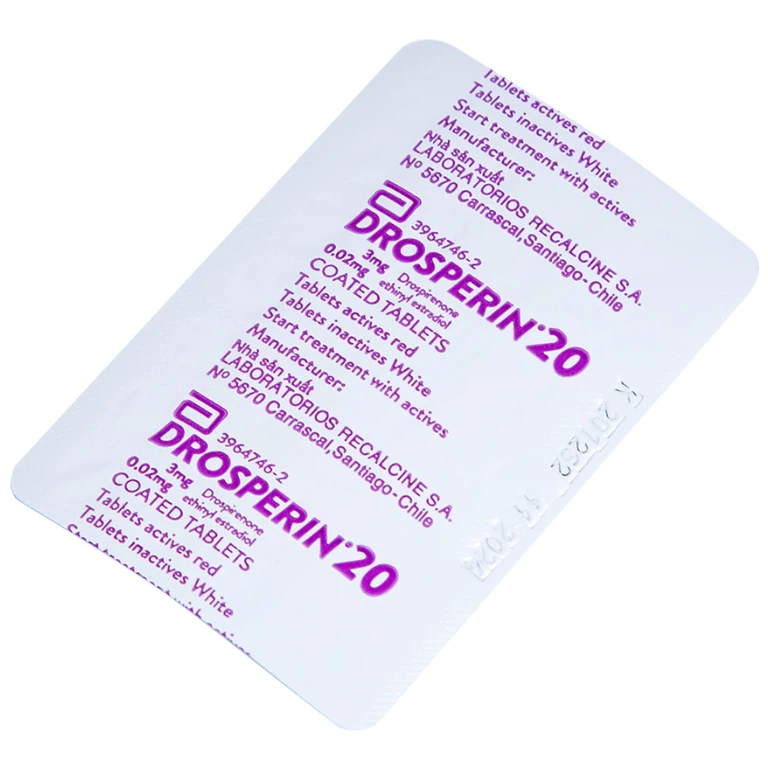Drosperin 20 thành phần chính drospirenone 3 mg và ethinyl estradiol 20 mcg là thuốc tránh thai dùng hằng ngày, có dạng bào chế viên nén bao phim, mỗi hộp chứa 28 viên gồm: 24 viên hoạt tính (màu đỏ), 4 viên giả dược (màu trắng).
