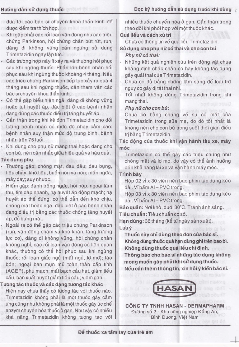 Mức độ an toàn và hiệu quả của trimetazidin đối với bệnh nhân dưới 18 tuổi chưa được đánh giá. Hiện không có dữ liệu trên đối tượng bệnh nhân này.
