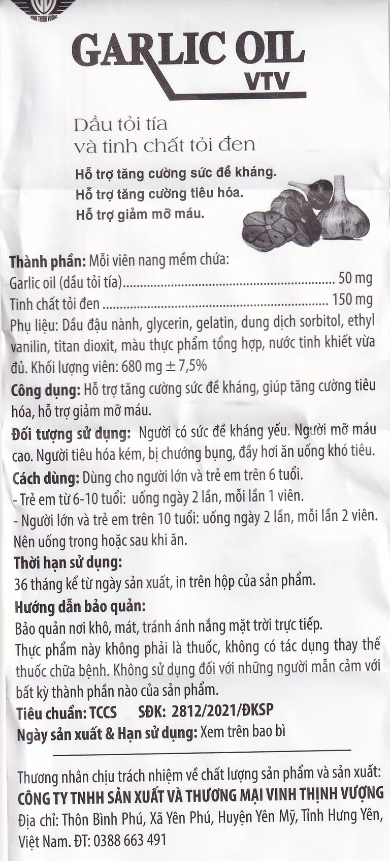 Garlic Oil VTV là sản phẩm của Công ty TNHH Sản xuất và Thương mại Vinh Thịnh Vượng, được sản xuất trên dây chuyền khép kín đạt tiêu chuẩn GMP của Bộ Y tế.