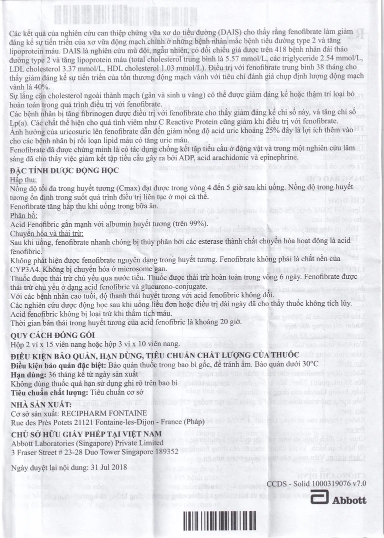 Thuốc được thải trừ chủ yếu qua nước tiểu. Thuốc được thải trừ hoàn toàn trong vòng 6 ngày. Fenofibrate được thải trừ chủ yếu ở dạng acid fenofibric và glucurono – conjugate.