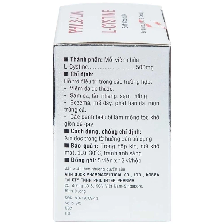 Viên nang mềm L-Cystine 500mg Phils Lin hỗ trợ điều trị viêm da do thuốc, sạm da, tàn nhang, eczema (12 vỉ x 5 viên)