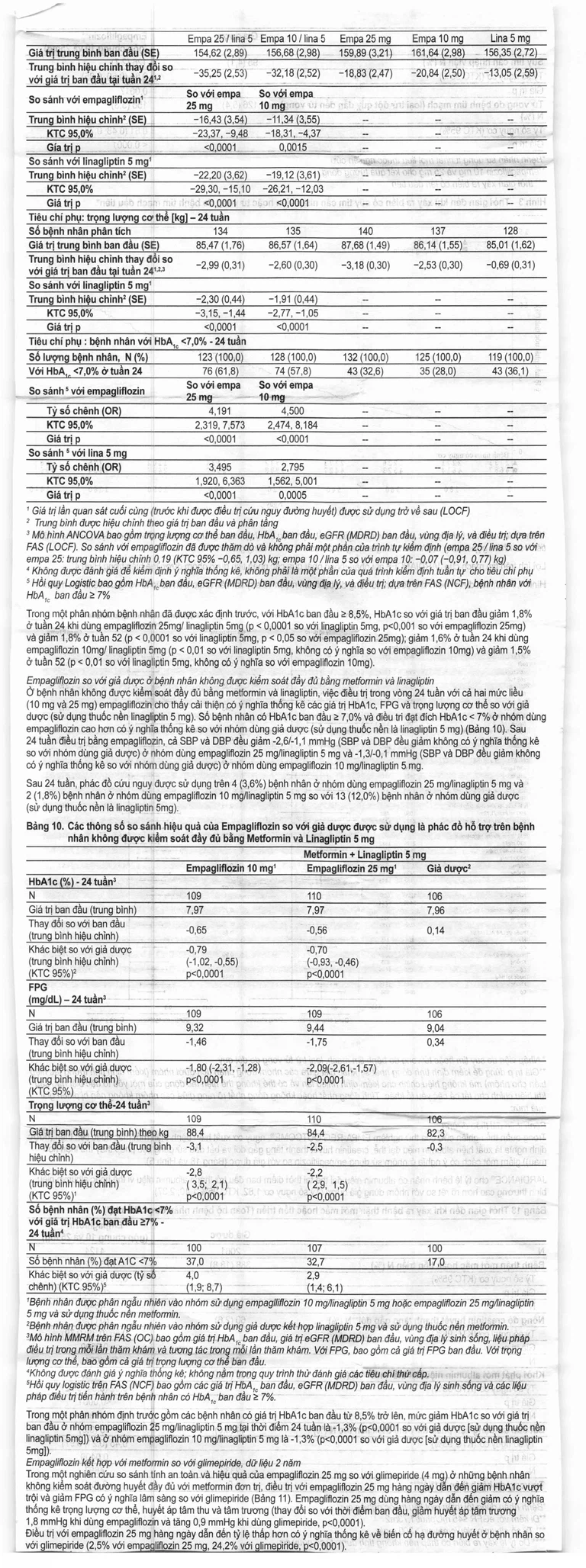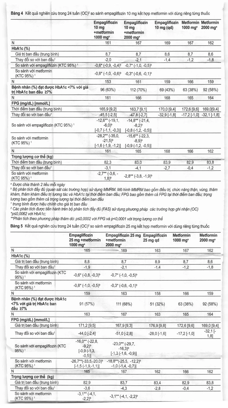 Ở những bệnh nhân đã dung nạp empagliflozin liều 10mg một lần trong ngày, có eGFR ≥45ml/phút/1,73m2 và cần kiểm soát đường huyết chặt chẽ hơn, có thể tăng liều lên 25mg một lần trong ngày. Liều tối đa mỗi ngày là 25mg.