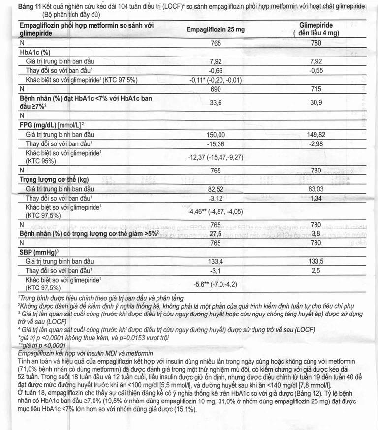 - Kinh nghiệm điều trị trên những bệnh nhân từ 85 tuổi trở lên còn hạn chế. Không khuyến cáo điều trị khởi đầu empagliflozin ở nhóm bệnh nhân này.