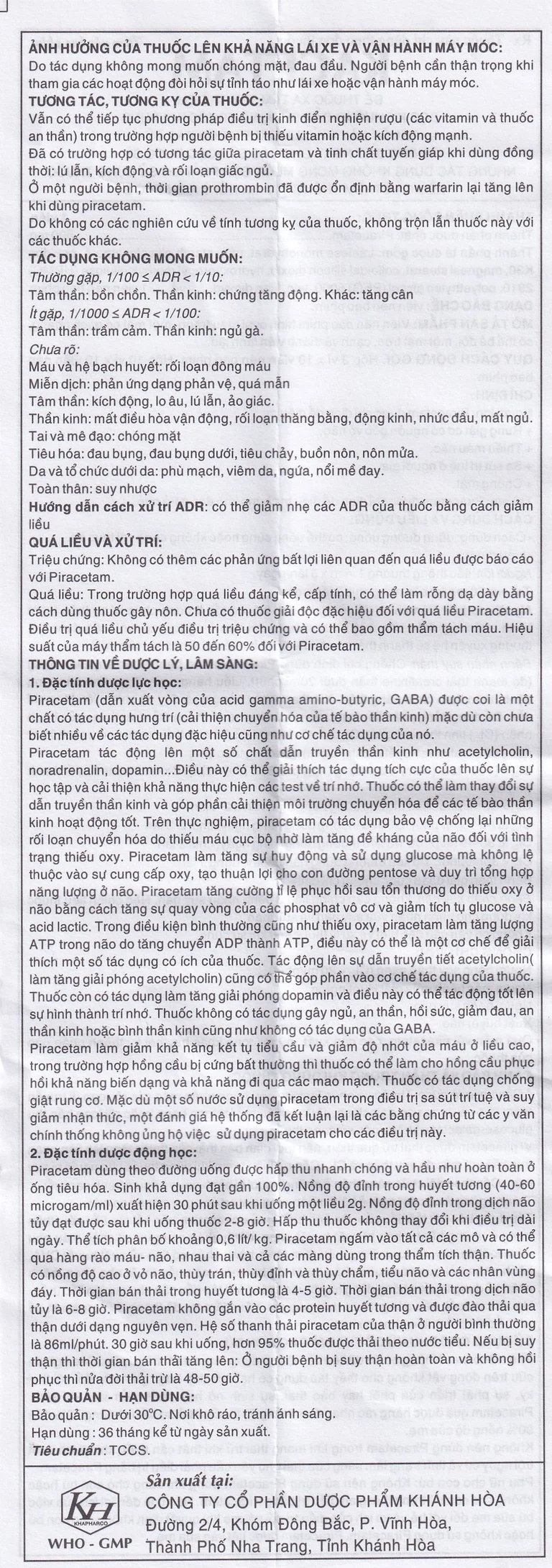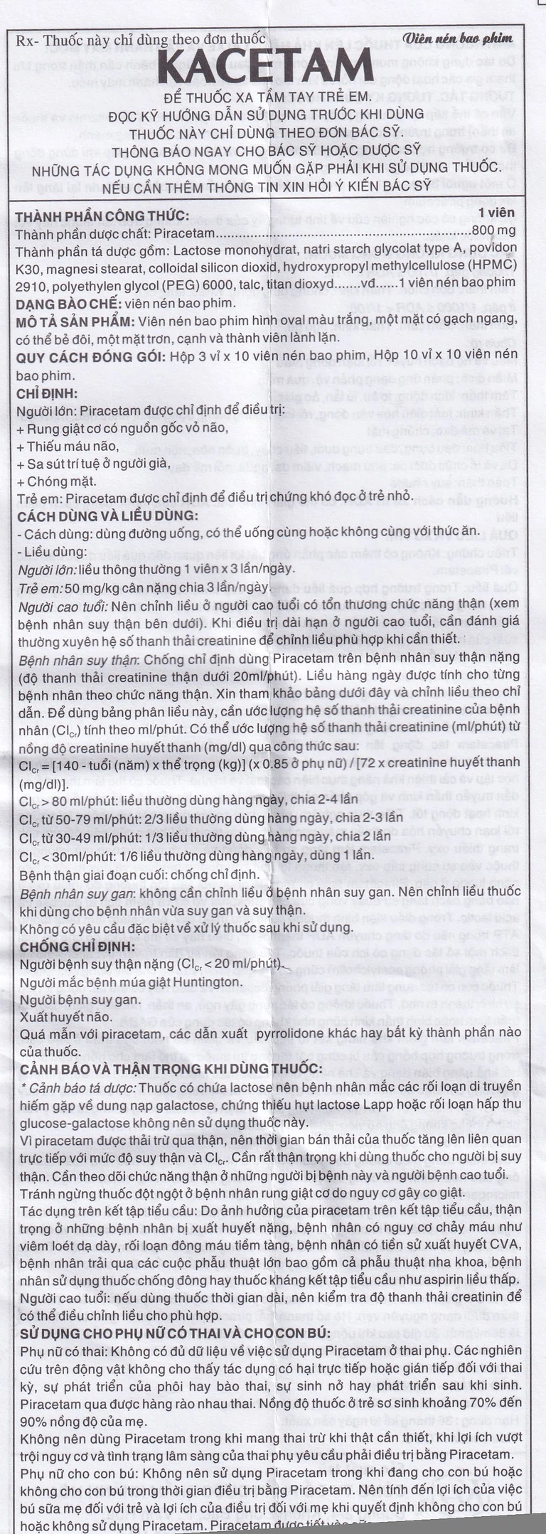 Thuốc Kacetam 800mg 10×10 do Công ty Cổ phần Dược phẩm Khánh Hoà sản xuất có chứa Piracetam 800 mg có công dụng điều trị các triệu chứng chóng mặt, suy giảm trí nhớ, kém tập trung, ở người cao tuổi: Suy giảm trí nhớ, chóng mặt, kém tập trung, thay đổi khí sắc, rối loạn hành vi, kém chú ý đến bản thân, sa sút trí tuệ do nhồi máu não nhiều ổ, điều trị nghiện rượu, trị bệnh thiếu máu hồng cầu liềm, dùng bổ trợ trong điều trị giật rung cơ có nguồn gốc vỏ não.
