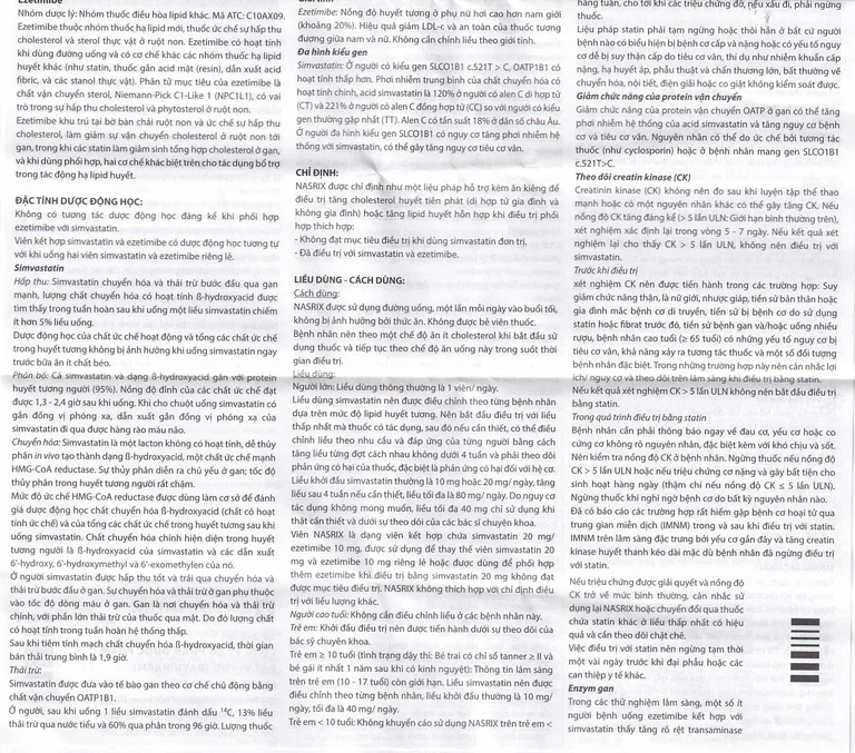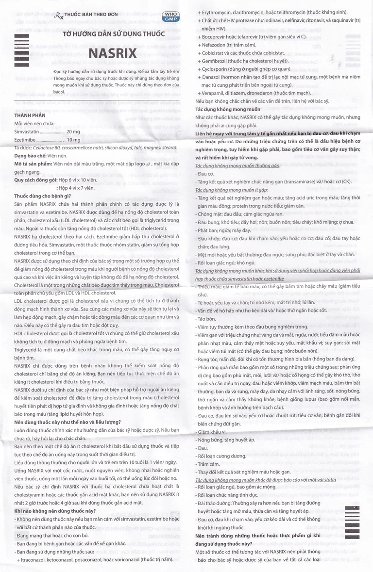 Viên Nasrix là dạng viên kết hợp chứa simvastatin 20mg/ezetimibe 10mg, được sử dụng để thay thế viên simvastatin 20mg và ezetimibe 10mg riêng lẻ hoặc được dùng để phối hợp thêm ezetimibe khi điều trị bằng simvastatin 20mg không đạt được mục tiêu điều trị. Nasrix không thích hợp với chỉ định điều trị với liều lượng khác.