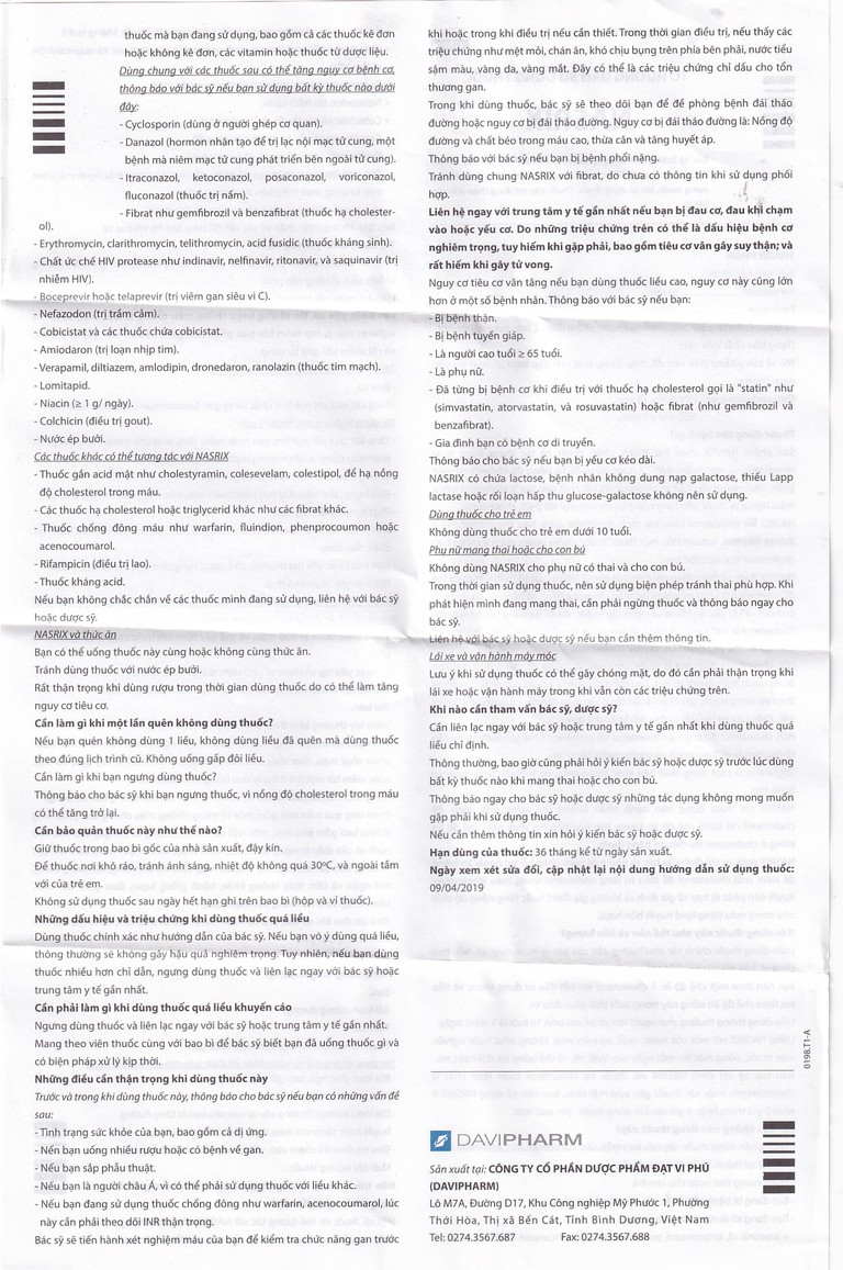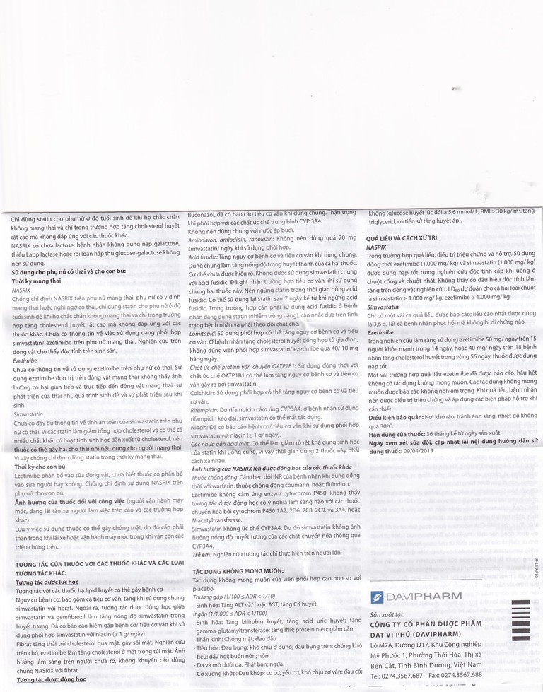 Thuốc Nasrix được sản xuất bởi Công ty Dược phầm Đạt Vi Phú (DAVIPHARM), có thành phần chính là ezetimibe và simvastatin. Nasrix được chỉ định như một liệu pháp hỗ trợ kèm ăn kiêng để điều trị tăng cholesterol huyết tiên phát (dị hợp tử gia đình và không gia đình) hoặc tăng lipid huyết hỗn hợp khi điều trị phối hợp thích hợp: Không đạt mục tiêu điều trị khi dùng simvastatin đơn trị, đã điều trị với simvastatin và ezetimibe.