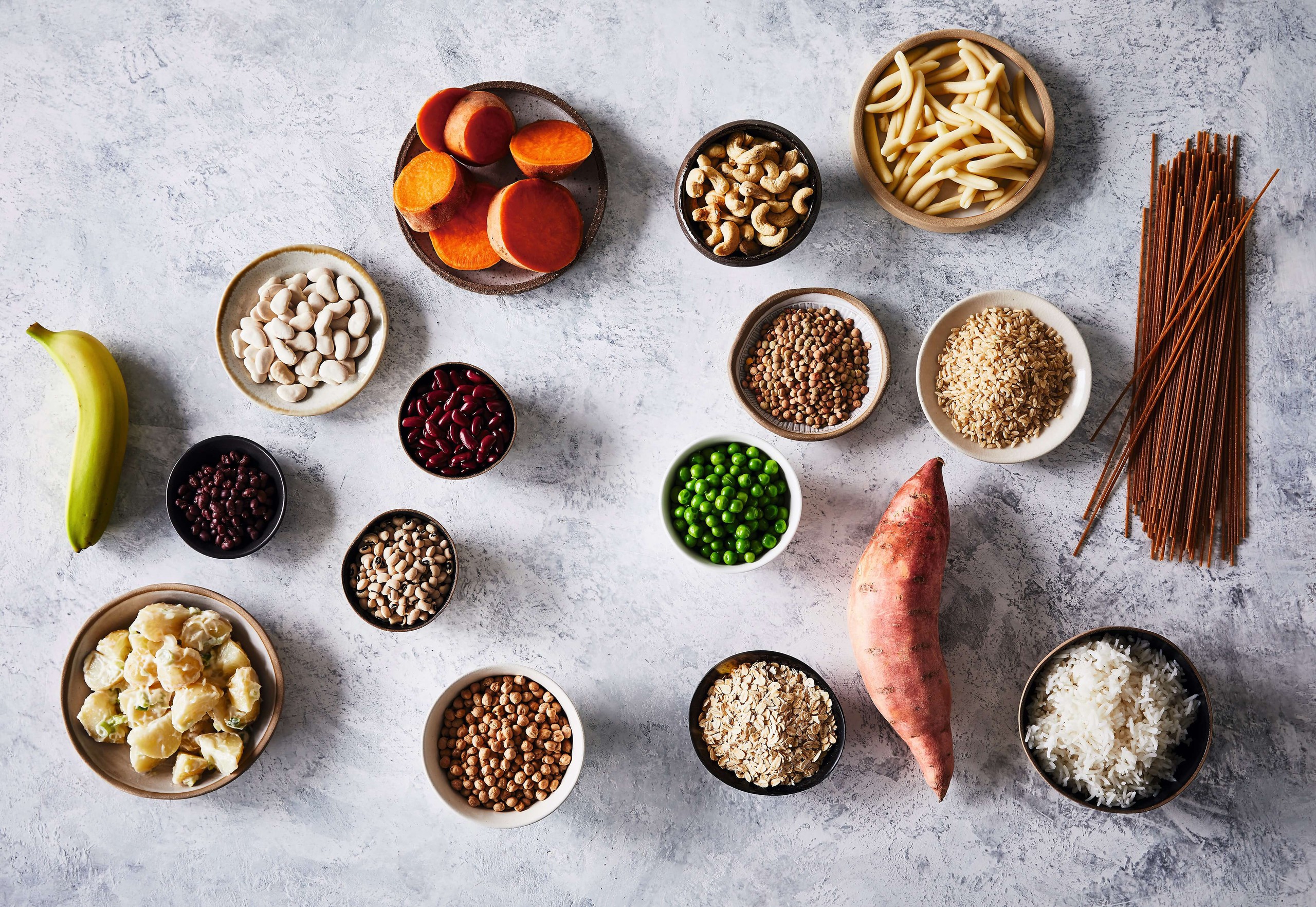 Trong chế độ ăn giảm cân, bạn nên lựa chọn các thực phẩm giàu chất xơ và vẫn còn lớp vỏ cám như yến mạch, ngũ cốc nguyên hạt, khoai lang, gạo lứt và các loại đậu. Những loại tinh bột này sẽ giúp giải phóng năng lượng từ từ và no lâu hơn từ đó giúp hỗ trợ quá trình giảm cân. Ngoài ra các loại tinh bột này còn giúp ổn định đường huyết cũng như hạn chế việc tích trữ mỡ thừa.