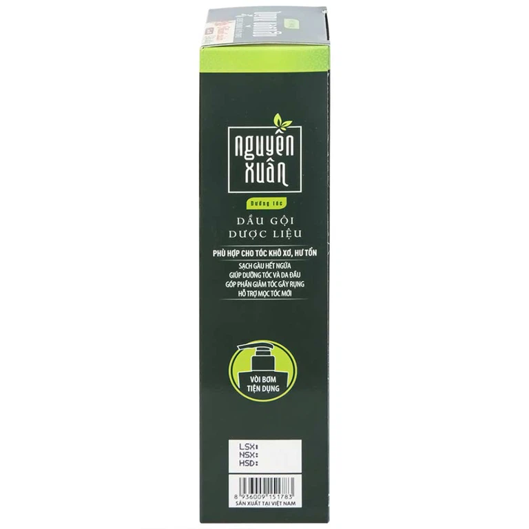 Sản phẩm dầu gội Nguyên Xuân màu xanh lá có hiệu quả cực tốt đối với da đầu khô và tóc bị gãy rụng. Với chiết xuất từ các thành phần tự nhiên lành tính, loại dầu gội này giúp cải thiện tình trạng tóc bị xơ rối, không sức sống trở nên bóng mượt hơn.