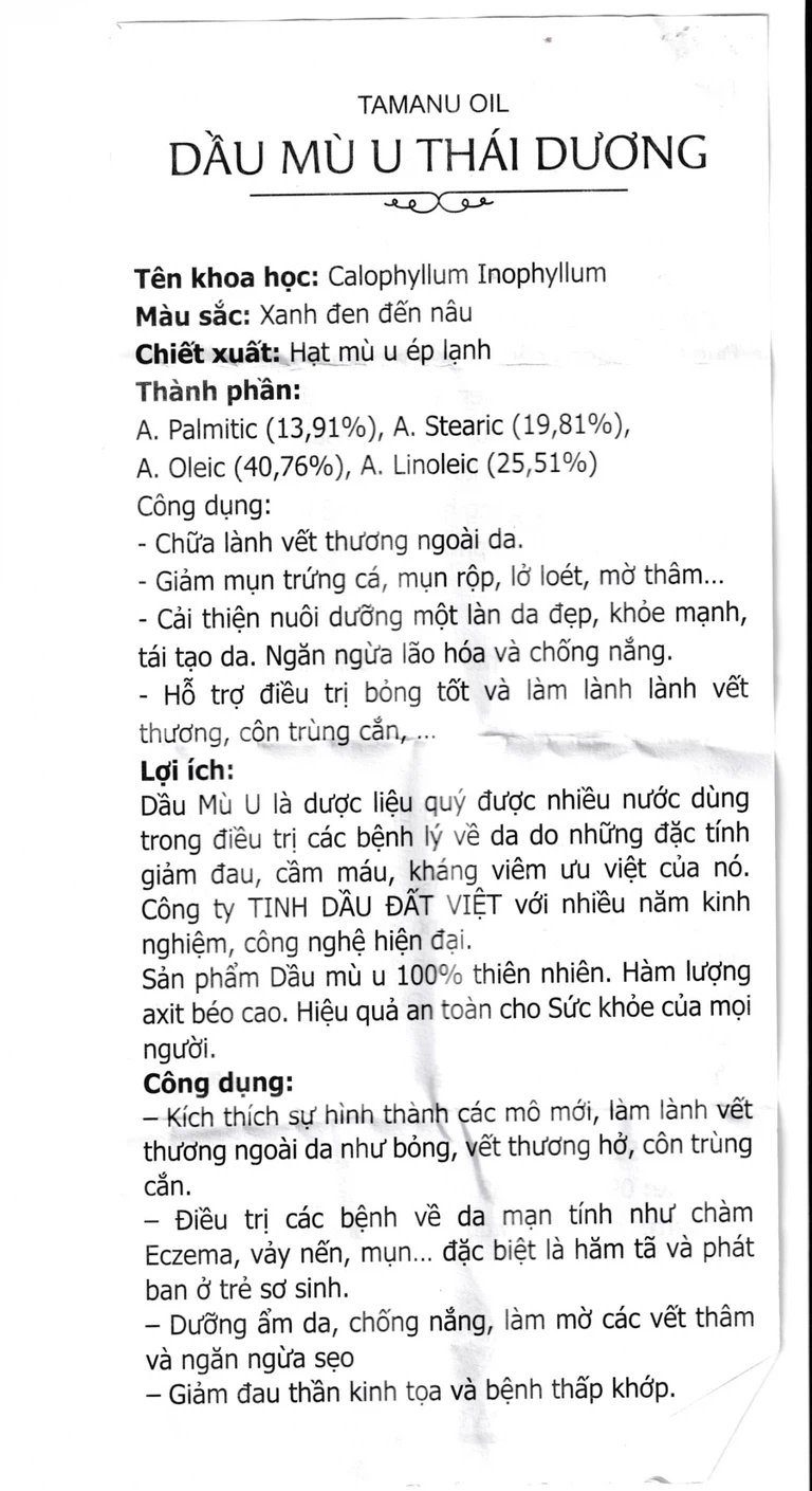 Dầu Mù U Thái Dương khai thác 100% dầu mù u thiên nhiên, có hàm lượng axit béo cao, trong đó nổi bật với 4 dưỡng chất chính: