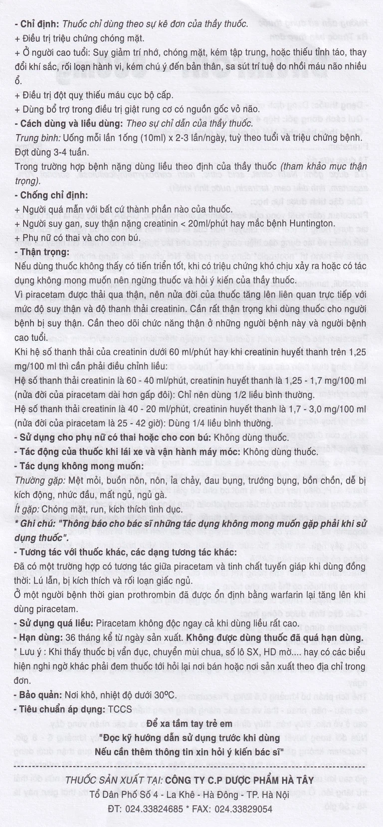 - Hệ số thanh thải creatinin là 40 – 20ml/phút, creatinin huyết thanh là 1,7 – 3,0mg/100 ml (nửa đời của piracetam là 25 – 42 giờ): Dùng 1/4 liều bình thường.