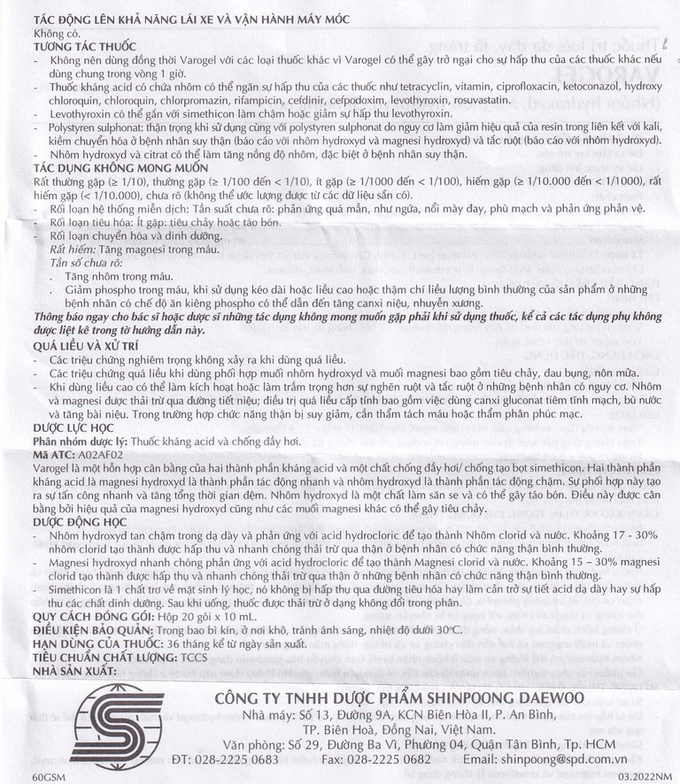 Varogel là thuốc kháng acid có thành phần nhôm hydroxid, magnesi hydroxid và simethicon. Nhôm hydroxid và magnesi hydroxid tan trong acid dịch vị, giải phóng các anion có tác dụng trung hòa acid dạ dày, hoặc làm chất đệm cho acid dạ dày, nhưng không tác động đến sự sản sinh ra dịch dạ dày.