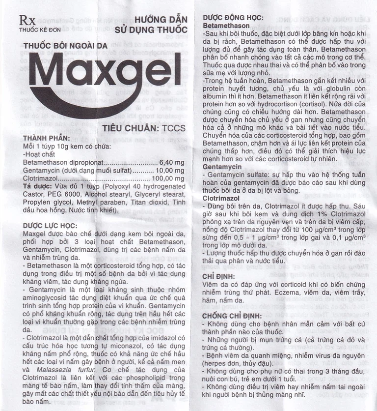 Kem bôi Maxgel được bào chế dưới dạng kem bôi ngoài da, phối hợp bởi 3 loại hoạt chất betamethason, gentamycin, clotrimazol, dùng trị các bệnh nấm da và nhiễm trùng da.