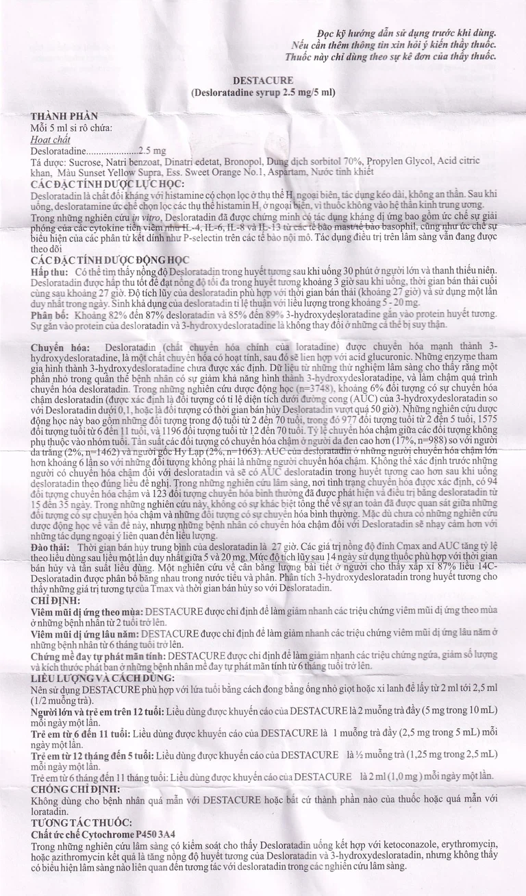 Destacure 2.5mg/5ml của nhà sản xuất Gracure (Ấn Độ), thành phần chính desloratadine, là thuốc dùng để điều trị viêm mũi dị ứng theo mùa, viêm mũi dị ứng lâu năm, chứng mề đay tự phát mãn tính.