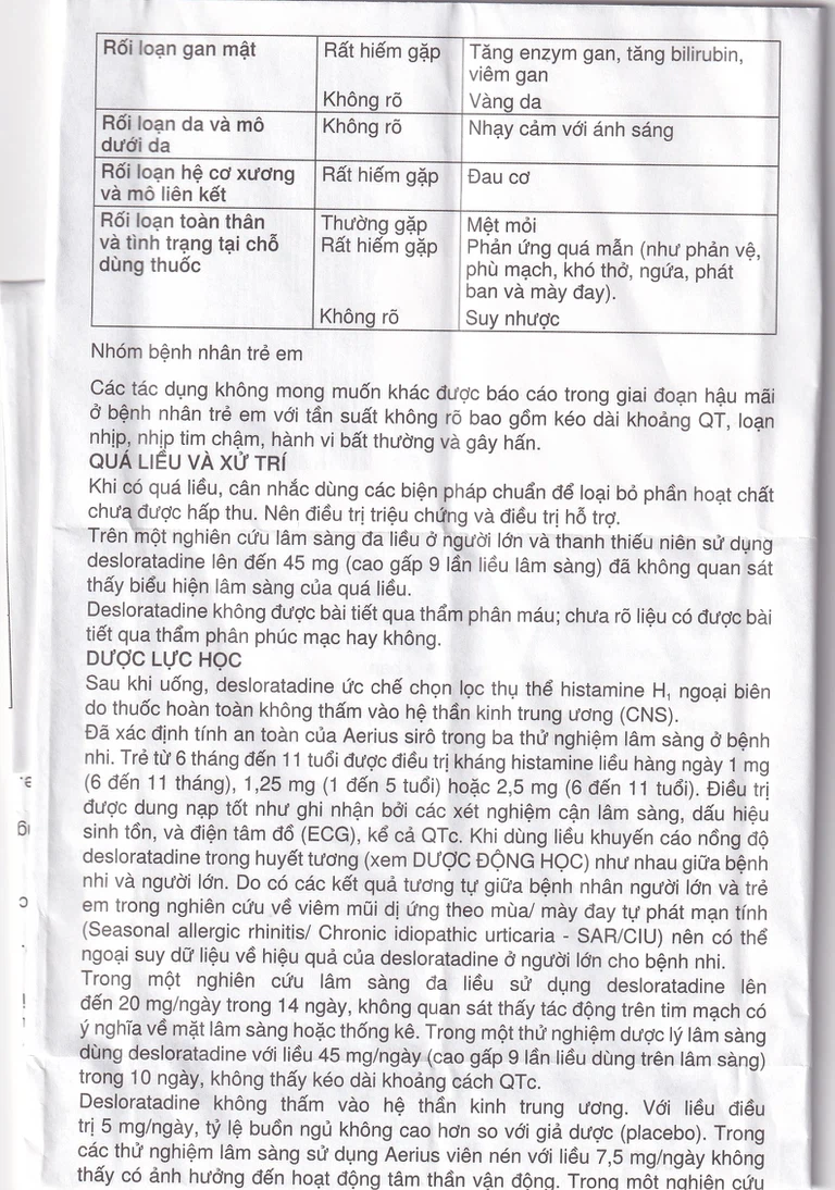 Tính an toàn và hiệu quả của Aerius viên nén vẫn chưa được nghiên cứu ở trẻ dưới 12 tuổi.