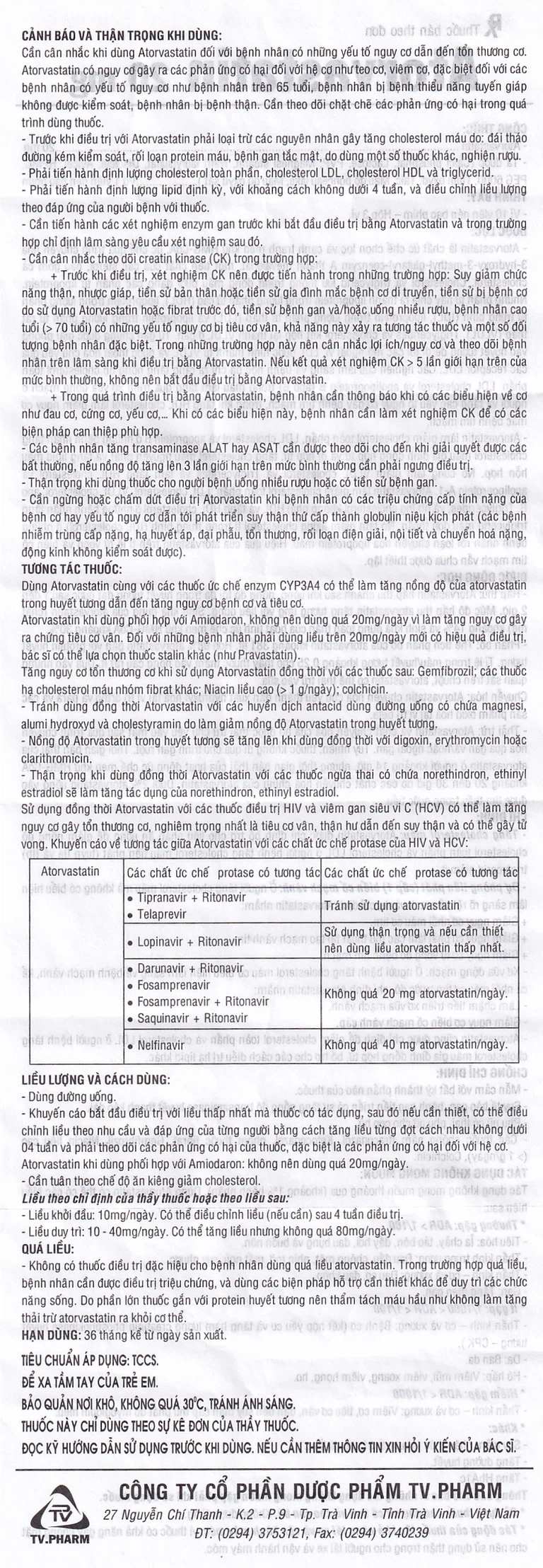 Trước khi điều trị, xét nghiệm CK nên được tiến hành trong những trường hợp: Suy giảm chức năng thận, nhược giáp, tiền sử bản thân hoặc tiền sử gia đình mắc bệnh cơ di truyền, tiền sử bị bệnh cơ do sử dụng atorvastatin hoặc fibrat trước đó, tiền sử bệnh gan và/hoặc uống nhiều rượu, bệnh nhân cao tuổi (> 70 tuổi) có những yếu tố nguy cơ bị tiêu cơ vân, khả năng này xảy ra tương tác thuốc và một số đối tượng bệnh nhân đặc biệt. Trong những trường hợp này nên cân nhắc lợi ích/nguy cơ và theo dõi bệnh nhân trên lâm sàng khi điều trị bằng atorvastatin. Nếu kết quả xét nghiệm CK > 5 lần giới hạn trên của mức bình thường, không nên bắt đầu điều trị bằng atorvastatin.