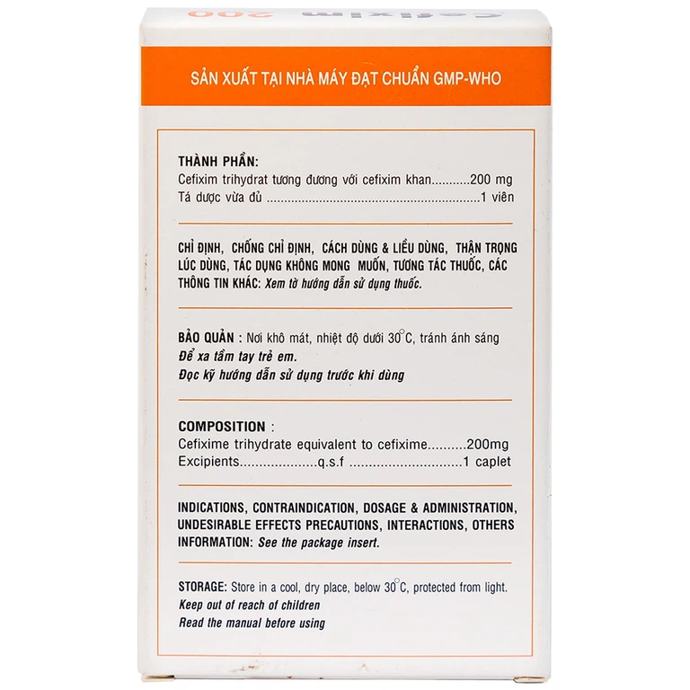 Cefixim 200mg dạng viên nén bao phim chứa hoạt chất Cefixim Trihydrat được sản xuất bởi Công ty Cổ phần Dược phẩm Cửu Long.