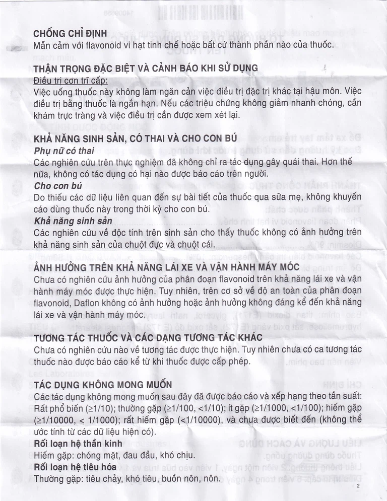 Triệu chứng: Có rất ít kinh nghiệm về việc sử dụng quá liều Daflon 500Mg. Các tác dụng không mong muốn được báo cáo khi dùng quá liều thường là các rối loạn về tiêu hóa (buồn nôn, nôn, đau bụng).