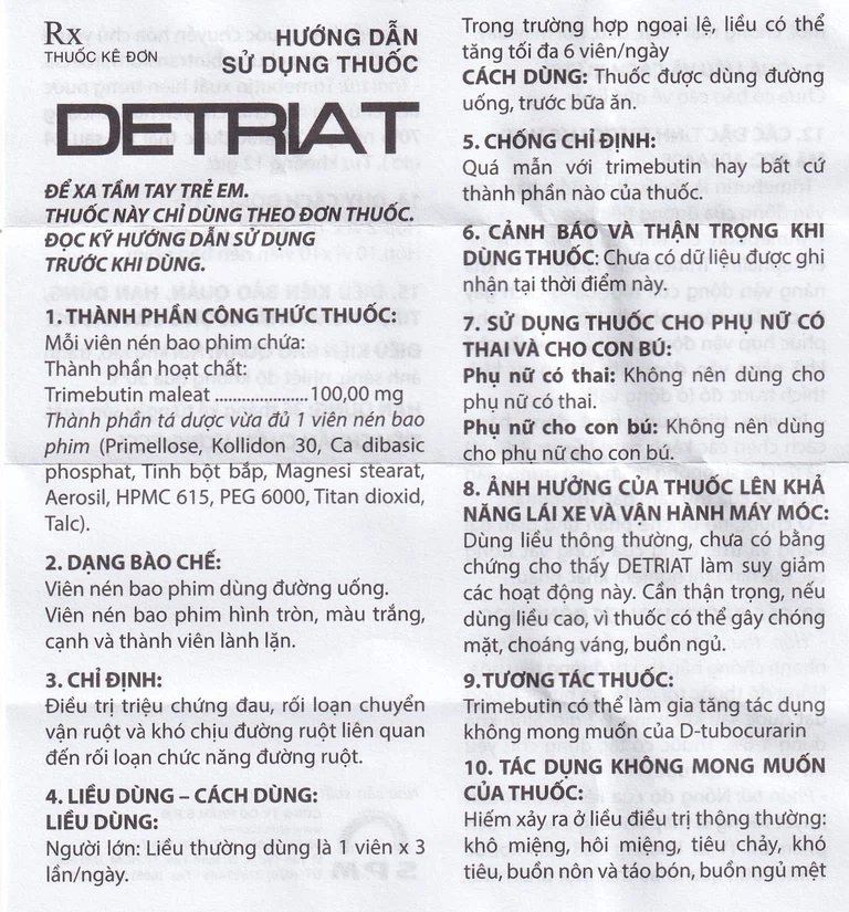 Thuốc Detriat chống chỉ định trong các trường hợp sau: Quá mẫn với trimebutin hay bất cứ thành phần nào của thuốc.