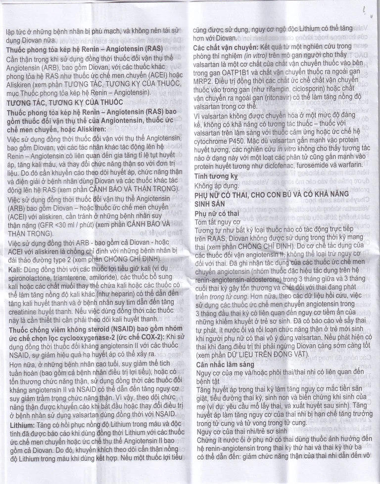 Cần thận trọng khi sử dụng đồng thời thuốc đối kháng thụ thể Angiotensin (ARBs), bao gồm Diovan, với các thuốc khác phong tỏa hệ RAS như thuốc ức chế men chuyển (ACEIs) hoặc Aliskiren (xem phần TƯƠNG TÁC THUỐC, mục Thuốc phong tỏa kép hệ Renin-Angiotensin).