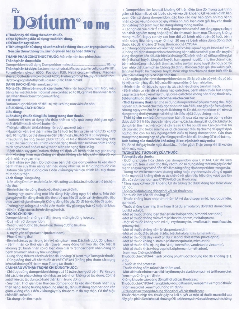 Luôn dùng thuốc đúng liều lượng trong đơn thuốc. Dotium chỉ nên sử dụng liều thấp nhất có hiệu quả trong thời gian ngắn nhất để kiểm soát nôn và buồn nôn. Thời gian điều trị tối đa không nên vượt quá một tuần.