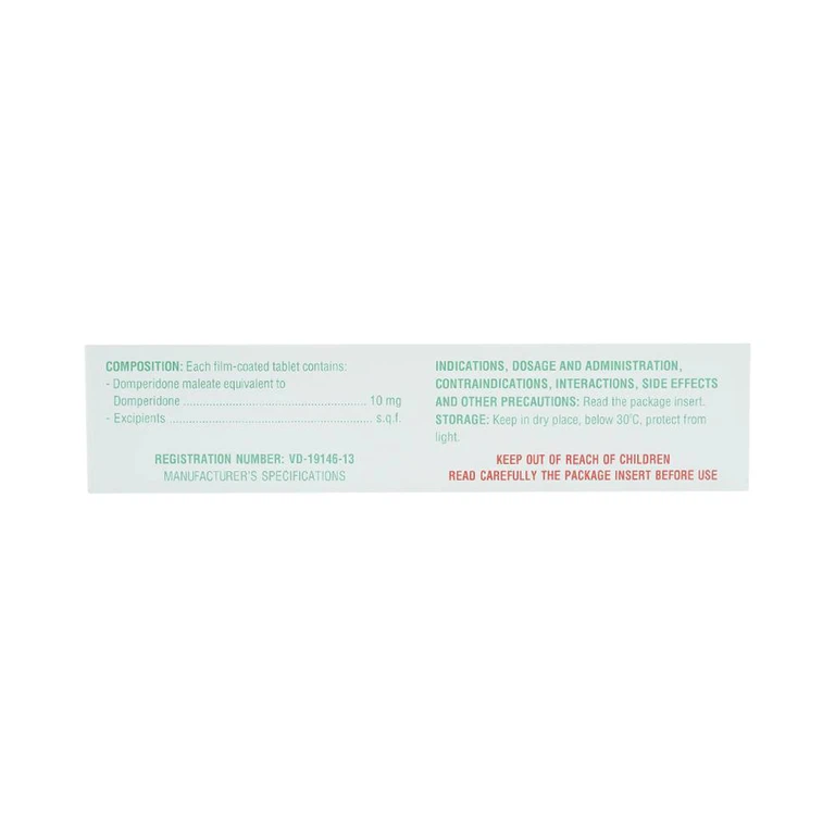 Sinh khả dụng đường uống của domperidone base không bị giảm nếu trước đó bệnh nhân uống đồng thời cimetidine hay natri bicarbonate. Thời gian đạt nồng độ đỉnh sẽ hơi chậm và AUC sẽ hơi tăng khi thuốc được uống sau khi ăn.
