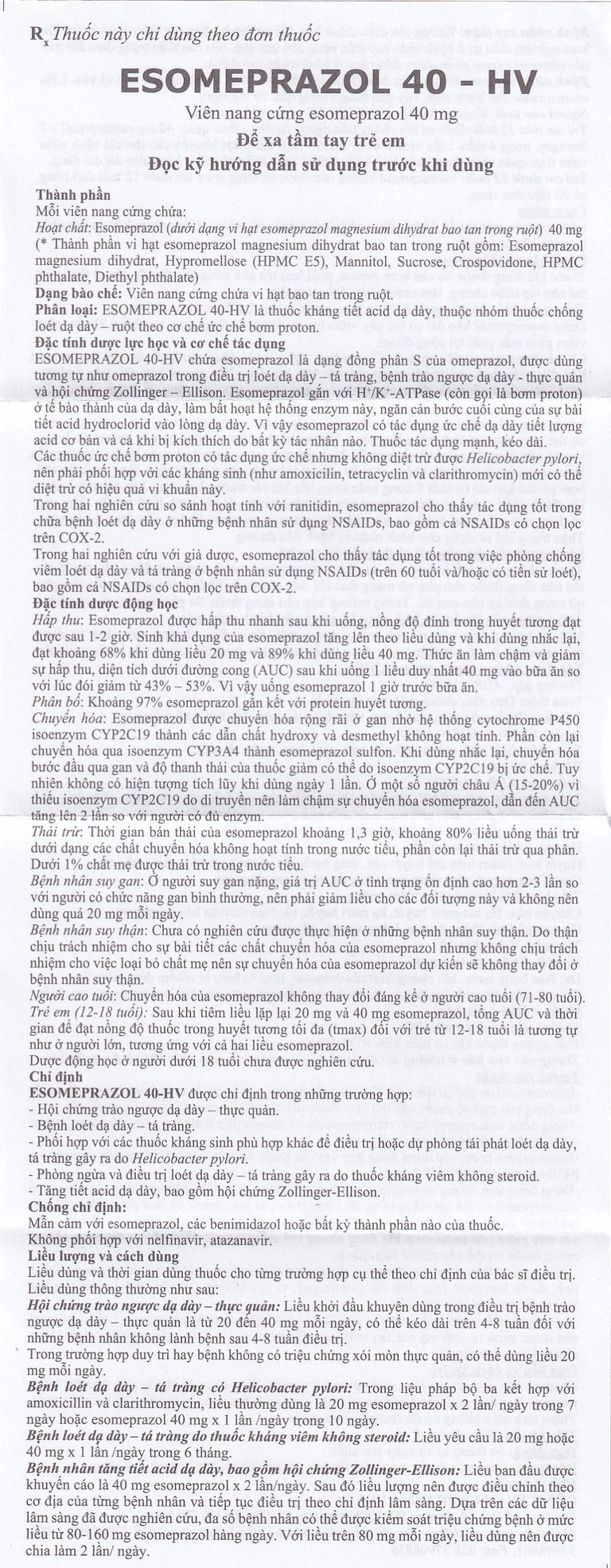 Esomeprazol 40 HV chứa esomeprazol là dạng đồng phân S của omeprazol, được dùng tương tự như omeprazol trong điều trị loét dạ dày – tá tràng, bệnh trào ngược dạ dày – thực quản và hội chứng Zollinger – Ellison. Esomeprazol gắn với H+/K+ – ATPase (còn gọi là bơm proton) tế bào thành của dạ dày, làm bất hoạt hệ thống enzym này, ngăn cản bước cuối cùng của sự bài tiết acid hydroclorid vào lòng dạ dày. Vì vậy esomeprazol có tác dụng ức chế dạ dày tiết lượng acid cơ bản và cả khi bị kích thích do bất kỳ tác nhân nào. Thuốc tác dụng mạnh, kéo dài.