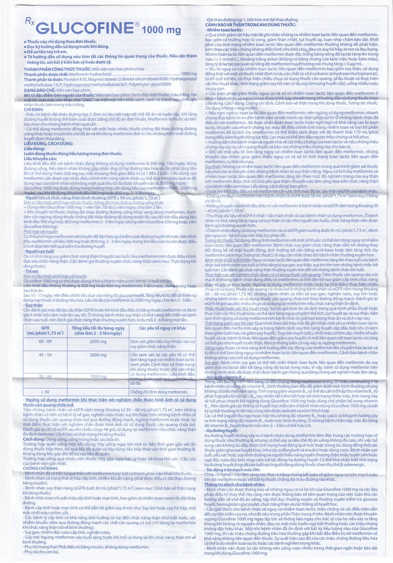 Bệnh nhân cần được thông báo về những nguy cơ và lợi ích của Glucofine 1000mg và các liệu pháp điều trị thay thế. Họ cũng nên được thông báo về tầm quan trọng của việc tuân thủ các hướng dẫn về chế độ ăn uống, tập thể dục thường xuyên và thường xuyên kiểm tra glucose huyết, hemoglobin glycosylat, chức năng thận và các thông số huyết học.